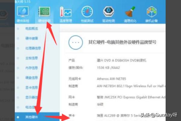 6.可以通过硬件体检查看声卡的运行状况,也可以通过硬件检测的其他选项查看声卡的信息。
