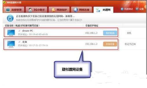 或者使用360安全卫士的流量防火墙防蹭网工具来查看路由器的连接设备信息。